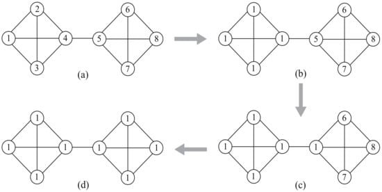 The sample network shown in Figure 2 illustrates that randomness will affect the accuracy of LPA. Initially, each node has a unique label (Figure 2a). Suppose that, at some step, the nodes in the left community have shared the same label 1, while the nodes in the right community still have unique labels 5–8 (Figure 2b). If node 5 randomly selects label 1 as its new label (Figure 2c), then all of the nodes may eventually be divided into the same community (Figure 2d). The random strategies implemented in the algorithm lead to the randomness of LPA.