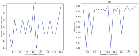 Figure 3 displays the result of community detection by LPA on Zachary karate club network [54]. It can be concluded that the number of communities and modularity in twenty experiments are fluctuant, which proves the division result of LPA is unstable and inaccurate.