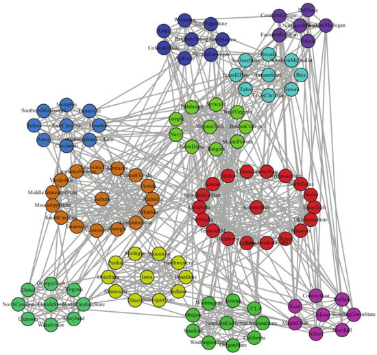 11 communities, as shown in Figure 6, are obtained by LPA-MNI algorithm, which outperforms Fastgreedy (six communities), Leading eigenvector (eight communities), Walktrap (ten communities), NIBLPA (nine communities), and EdMot (nine communities). Table 5 shows the experiment results of seven algorithms on football and the better Q, NMI, and AMI are in boldface. The NMI of LPA-MNI and EdMot are greater than that of other five methods. In addition, modularity shows that LPA-MNI is superior to other comparison algorithms besides Walktrap and EdMot.