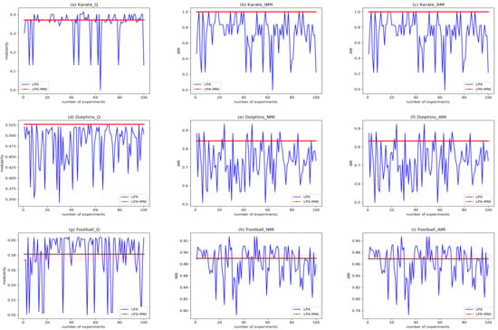 In order to show the improvement of the proposed algorithm in stability, the experimental results of LPA-MNI and LPA for 100 times on karate, dolphins, and football are displayed in Figure 7. It can be seen from Figure 7a–c that the modularity (Q), NMI, and AMI of LPA on the karate network in 100 experiments are fluctuant, while Q, NMI, and AMI of LPA-MNI in each experiment are 0.372, 1, and 1 respectively, which is very stable. Figure 7d–f display that the modularity of LPA fluctuates between 0.35–0.50, NMI fluctuates between 0.5–0.9, and AMI fluctuates between 0.5–0.9. The results reveal that LPA-MNI is a more robust method when compared with LPA on the dolphins network. Figure 7g–i exhibits that, on the football network, LPA-MNI has a stable value in each experiment, yet LPA is unstable. Information entropy [70] is used to reflect the uncertainty of information sources. Therefore, we calculate the information entropy of Q, NMI, and AMI sequences that were obtained by the two algorithms. The information entropy of Q, NMI, and AMI obtained by LPA on karate network are as follows: 3.941, 3.830, and 3.830. Additionally, on the dolphins network, they are: 5.612, 5.660, and 5.660. The results obtained on the football network are as follows: 5.597, 5.937, and 5.937. For LPA-MNI, the information entropy of its results on all networks are 0. Therefore, it can be concluded that LPA-MNI significantly improves the stability of community detection.