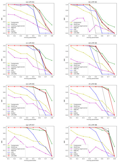 Figure 8 and Figure 9 illustrate the experimental results of LFR benchmark networks, and the result of LPA is the average value obtained by running 100 times. The results indicate that all algorithms have good performance, since the mixing parameter is small. With the increase of , the network becomes increasingly complex, which makes it more difficult to reveal the community. The LPA-MNI algorithm has stable and good performance on LFR N1-N4 under , on LFR N5-N8 under . However, the performance of Fastgreedy and Leading eigenvector decrease obviously when , and the performance of LPA drops significantly when , which is same to NIBLPA. In all of the experiments, LPA-MNI algorithm generally outperforms other four compared algorithms LPA, Fastgreedy, Leading eigenvector, and NIBLPA in all datasets. Additionally, the EdMot algorithm obtains the comparable results with LPA-MNI algorithm. Although Walktrap has a slightly higher value of NMI when , LPA-MNI can obtain better results on LFR N1-N4 under and on LFR N5-N8 under .