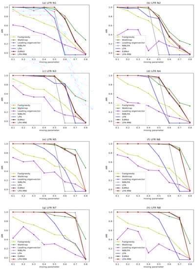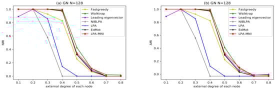 In this section, two types of synthetic networks, namely Lancichinetti–Fortunato–Radicchi (LFR) [71] and Girvan–Newman (GN) [4], are used to test the performance of LPA-MNI. The results are compared with six algorithms introduced in Section 4.1, and NMI and AMI are treated as the evaluation metrics.