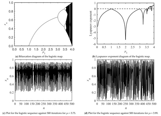 In order to further determine the value range of parameter μ1 when the logistic map generates a chaotic sequence, the bifurcation diagram and the Lyapunov exponent diagram of the logistic map are given as Figure 1. It is found that system (1) is chaotic when the control parameter μ1 ∈ (3.57, 4) and xn ∈ (0, 1).