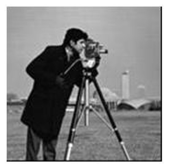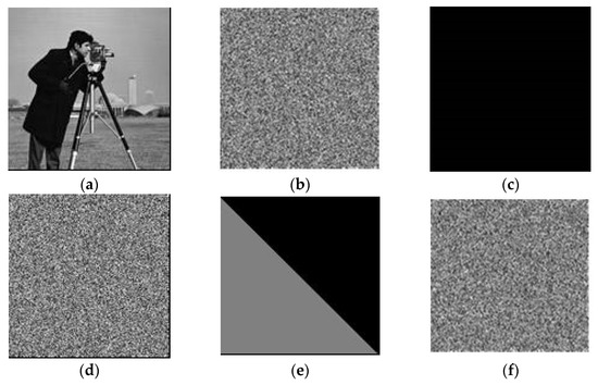 The experimental image is an 8-bit grayscale image, Cameraman, of size 256 × 256. The process is as follows: choose keys x0 = 0.8578, = 3.6832, y0 = 0.3476, = 1.5866; encrypt the image, Cameraman, size 256 × 256, with a pixel value of 0, and a special image of size 256 × 256 as Formula (12) to obtain the corresponding encrypted image, as shown in Figure 3b,d,f. According to Figure 3d, the mask matrix, M, can be decrypted without knowing the key. The permutation sequences, RS and CS, can be decrypted by combining the matrix, M, and Figure 3f. Therefore, all the equivalent keys can be decrypted. Furthermore, any encrypted image can be decrypted by using the equivalent keys. After attacking the encrypted image, Figure 3b, the recovered image is shown in Figure 4.
