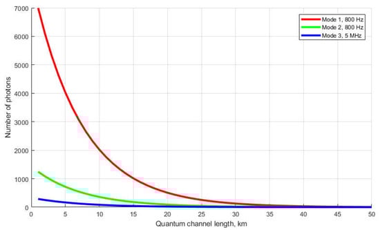 The most appropriate form of synchronization signal for the QKDS is a periodic sequence of optical pulses [3]. In this case, the time markers are the pulses themselves, and the measurement process consists of dividing the entire follow-up period into time intervals. The conversion of a photon to a primary electron is registered in each time interval. The results of live tests of a quantum cryptographic network based on the IDQuantique Clavis2 3110 QKD system are described in [4,5,6,7], and it is shown that the synchronization process generates multiphoton pulses, and the photodetectors operate in linear mode. Using the constructed energy model of the current Clavis2 3110 QKD system, we show that the synchronization mode does not involve algorithms for controlling the emission power. Figure 1 shows the dependence of the number of photons in the pulse on the length of the quantum channel. The quantum channel is a fiber-optic communication line connecting two stations of the QKD system. Dependencies demonstrate three synchronization modes and take into account the following complex losses: in the optical fiber at the junction points, and total losses in the encoding station (−47.7 dBm). The energy model of the QKD system describes the characteristics of the detection equipment. In the process of high-precision determination of the length of a quantum channel, pulses are sent from the transmitting station to the encoding station, where they are reflected from the Faraday mirror and follow back along the same optical path. The process is divided into three stages, for each of which the pulse power values correspond to P1 = −48.3 dBm, P2 = −55.8 dBm, and P3 = −24.2 dBm. The values of P1, P2, and P3 were obtained experimentally using Yokogawa AQ2202 equipment. The photon energy with the refraction index for the Corning®SMF-28e+ fiber is equal to
