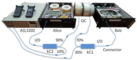 We configured the experimental design (Figure 2), where the quantum communication system stations were located in adjoining rooms. A quantum channel of variable length was organized between them. Corning®SMF-28e+ optical fiber coils with lengths (L) of 1, 2, 4, and 25 km were used for this. At the junction points of the optical coils, two fiber-optic couplers with division coefficients were connected in series: kC1 (70%, 30%) and kC2 (90%, 10%). The output of the transmitting station was connected to the input of the divider kC1, and the output of the divider kC1 (70%) was connected to the output of the divider kC2 (90%). The input of the kC2 divider was connected to the quantum channel in the direction of the receiver station. Outputs kC2 (10%) and kC1 (30%) were connected to an optical power meter (Yokogawa AQ2202) to capture signals.