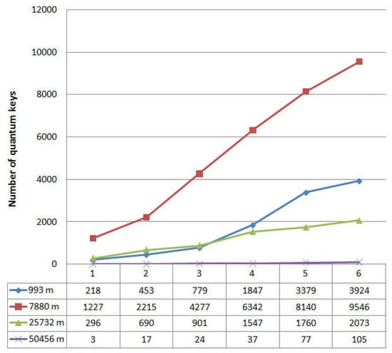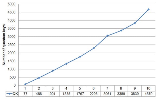 We can see that the graph does not contain any critical changes. Analysis of the dynamics of quantum error does not allow for the detection of unauthorized interference in the operation of the system. The latter is also confirmed by the graph in Figure 4, which shows the dynamics of generated quantum keys.