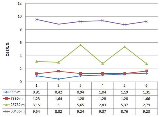 The graphs show that the maximum number of accumulated keys for 6 iterations is 9546, with a quantum channel length (L) of 7880 m. The graph shows a significant difference when the length of the fiber optic cable is 50,456 m. Here, the number of keys generated in one iteration differs significantly from the same value for a shorter length of the fiber optic link, while the growth dynamics is preserved. This dependence behavior is due to the fact that the limit length of the quantum channel introduces significant attenuation in the signal. The values 8.76 < QBER < 9.54 for a quantum channel length of 50,456 m are also high, but these values are not critical, because they do not exceed the calculated value QBER = 11%. Comparing the dynamics of changes in the number of accumulated keys and QBER in the presence of couplers and without them, let us turn to the dependencies in Figure 3, Figure 4, Figure 5 and Figure 6 that are plotted for the length of the quantum channel in 25,732 m. The QBER value is within 2.3 < QBER < 3.1 if there are couplers, and within 2.8 < QBER < 5.7 if there are no couplers. These values are valid and do not indicate the presence of an attacker in the communication channel. Moreover, in the experiment, the values in the absence of couplers exceeded the values in the presence of couplers. The latter indicates that external destabilizing factors have a more significant impact on QBER than the presence of additional prepared connections in the communication channel.