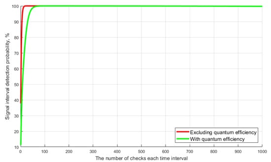 The simulation results show that the divergence of the calculation results for Equations (2)−(4) do not exceed 0.02% over the entire variation range in the number of time intervals. The registration validity condition for no more than one photoelectron and/or DCP is typical for a single-photon avalanche photodiode. This proves that it is possible to use expression (4) to calculate the probability of correctly detecting the time interval during the synchronization of the QKDS, provided that . An important parameter of the avalanche photodiode is the recovery time of the operating mode (). In the proposed method, the time interval poll is performed sequentially in each frame, i.e., one-time interval is analyzed for the repetition period (T); here . This approach allows the recovery time of the working mode of the photodetector to be ignored when calculating. Another distinctive feature of the single-photon mode of operation of the photodetector is the quantum efficiency coefficient of the photocathode (k), which must be taken into account when simulating. Let us look at the graphs in Figure 7, which demonstrate the dependence of the probability of correctly detecting the time interval with signal on the selection size. Dependencies are plotted using Equation (4). The developed method involves the use of a weakened optical synchronizing pulse with an average number of photons 0.1 < m < 1. Thus, given the critical values of the average number of photons per pulse, the frequency of DCP and the quantum efficiency of the photocathode, the variable value is only the selection size in each time interval. Let us explain that the DCP of the photodetector are its shot-noise, which can cause an avalanche effect [15,16,17].