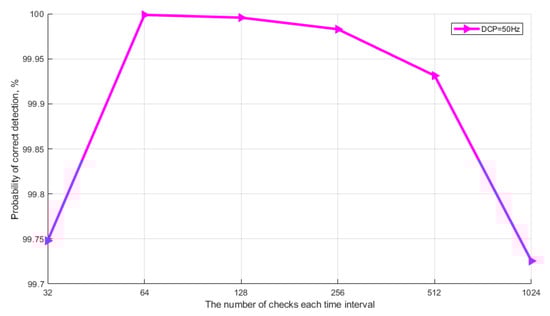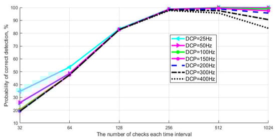 The graphs show that the probability of correct detection reaches maximum values already at the selection size N = 30 (without taking into account quantum efficiency) and at N = 150 with taking into account quantum efficiency. Note that the typical selection size of the current Clavis2 3110 system is 800. Next, let us consider the simulation results that show the influence of the frequency of DCP and the selection size on the probabilistic characteristics of detecting the signaling time interval. The task of simulation is to find the optimal values of N and DCP, at which the maximum probability of detection is achieved. Calculations were made taking into account the above average quantum efficiency of the photocathode (k = 25%). Figure 8 shows the results of simulation of the algorithm for detecting a single-photon signal. The graphs show the dependence of the probability of correct detection of the signaling interval on selection size for different values of DCP.