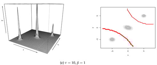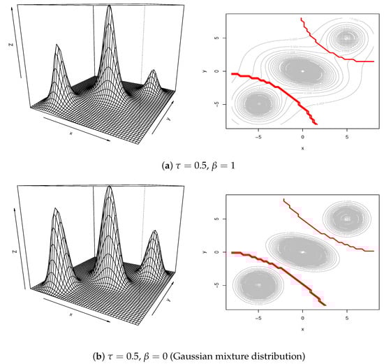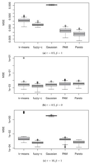 Figure 1 illustrates the perspective plots and contour plots for (10, 1). The shape of varies according to the values of and . The Gaussian mixture distribution corresponds with and in panel (b). When , the variance of each component increases and the contours connect with each other. On the other hand, for a large value of , the distribution shows high peaks around the centers. This indicates that , including fuzzy c-means when , has a quite different shape from he Gaussian mixture distribution. Other versions of the shapes are also illustrated in Appendix C. The performance of each method is evaluated by MSE based on 100 simulated samples with sample size .