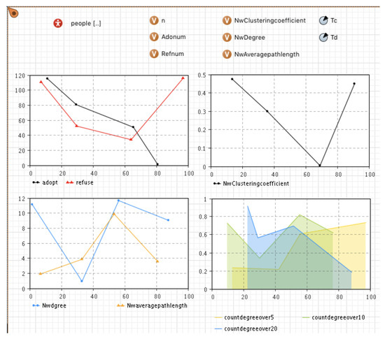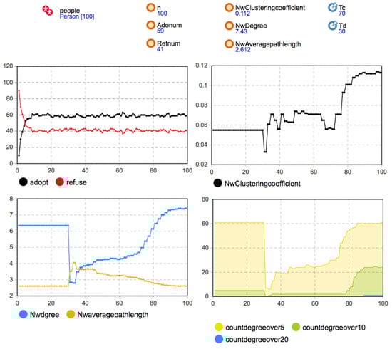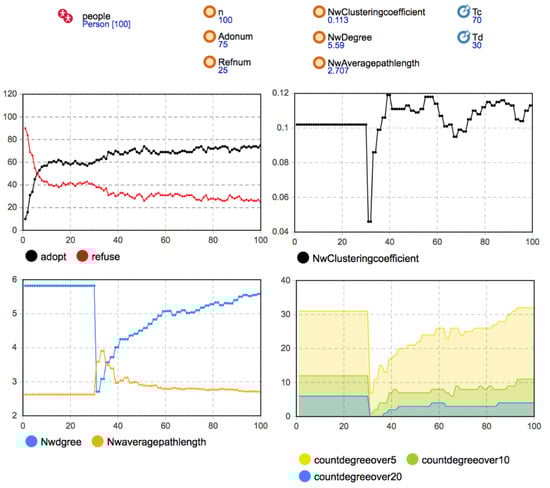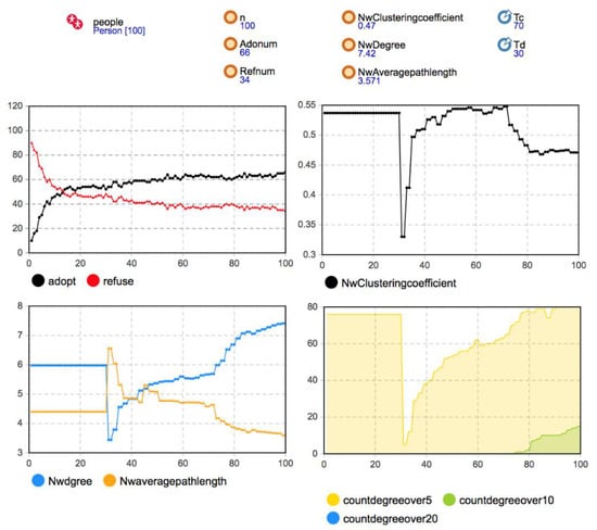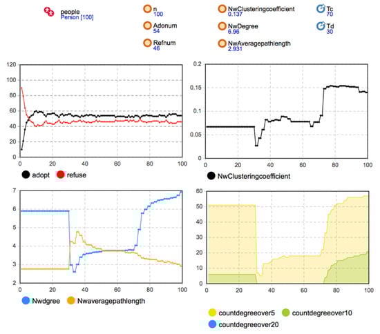 The simulation results show that when Td = 30, the aggregation coefficient, the average degree, and the average path length of the social network all had sudden changes. According to the existing disconnection rules of the network, when there is no one-way or two-way decision imitation between neighbor agents in a certain time step, the connection will be disconnected by way of probability triggering. Since the critical time of disconnection was 30, at the 31st time step and later, the agent that reaches the disconnection condition performed the disconnection operation with the probability of Disconnect = 0.8. Because of the high triggering probability, the network structure suddenly changed. This is reflected in the network’s statistical indicators. The disconnection of a large number of edges in the network significantly reduced the average degree of the network, the dense connections within the network were reduced to a certain extent, and the aggregation coefficient was significantly reduced. Moreover, because many edges were reduced, the connection between any two nodes required a longer path, so the average path length increased significantly. After T = 30, according to the rule of disconnection and reconnection, when the user’s own decision was the same as that of his previous neighbors, the agent’s irregular edge reconnected with the probability of Reconnect = 0.3. Therefore, with the connection’s gradual recovery, the aggregation coefficient and average degree of the network gradually increased. The average path length gradually decreased and tended to be stable after about 20 time steps. When Tc = 70, the network structure changed again. According to the new connection generation rule, the user and other users who had no contact before had the same decision-making. The user agents generated new connections with the probability of Newconnect = 0.08. Hence, the average degree of the network increased again, and the average path length decreased again. It can be seen that the simulation results present the preset network evolution rules, reflect the changes in the network structure in the process of innovation diffusion, and thus, prove the effectiveness of the developed simulation model.