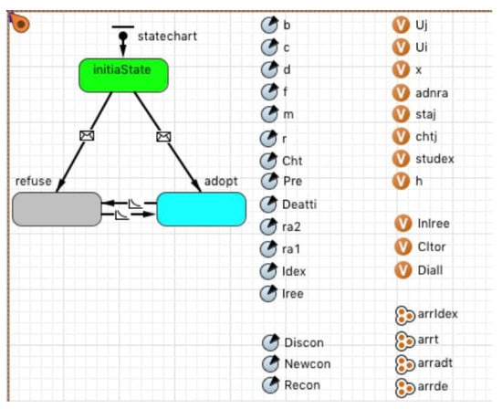 According to the conceptual simulation model mentioned above, a multi-agent model of mobile application diffusion considering the evolution of the social network was established in Anylogic 8 and is shown in Figure 1 and Figure 2. Figure 1 shows the developed multi-agent model. The “People” category refers to the collection of mobile application user agents, and each user is an agent. The other three charts show the changes in the above three statistical indicators of the network structure over time in the diffusion process. The network degree distribution chart adopts the broken line accumulation chart, showing the change of the number of nodes whose network medium value is more than 5, 10, and 20.