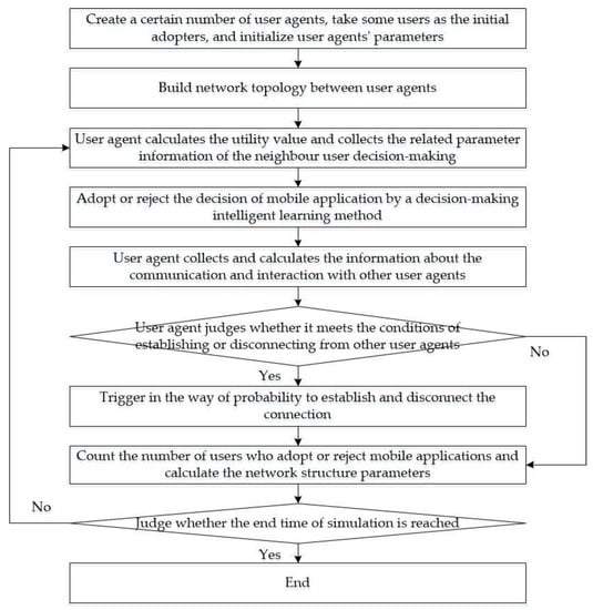 However, there are still some limitations in the current research, which needs more attention to be paid to the innovation diffusion of mobile applications. The existing simulation models have oversimplified the attribute characteristics of agents, especially decision-making and interaction. Most of them consider word-of-mouth effect and preference differences and do not involve complex agent interactions, such as strategy learning and decision imitation among individuals. There is a big difference between simulation models and the complex decision-making process and users’ mechanisms in real life. It needs to be further explored from an interdisciplinary perspective. Therefore, when using multi-agent simulation to study mobile application innovation diffusion, user agents’ attribute characteristics, behavior methods, and interaction rules were set to better reflect the complex decision-making process and mobile application users’ mechanisms in real society.