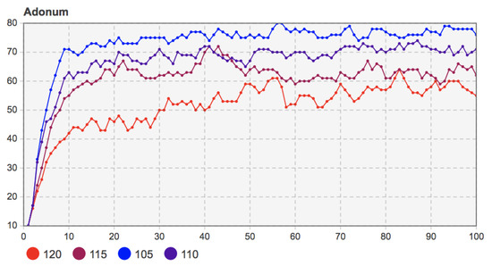 Sensitivity analysis of mobile application use cost c to the number of adopters (c = 105, 110, 115, 120).