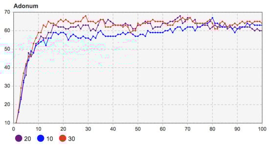 The parameters’ settings have a very important impact on the accuracy of the simulation results. Thus, the parameters’ settings of our work referred to Zhou’s [7] and Laciana’s studies [40]. The number of initial users was n = 100, and 10% of initial users were seed users. The parameters of mobile application diffusion were set as b = 90, c = 80, f = 55, and m = 0. The network effect intensity d was set to 10, the user’s individual preference was Pre ~ N (50, 10), and the user’s characteristic distribution was ϕCht = (0.3,0.3,0.4). The period of each experiment was 100 time steps (days).