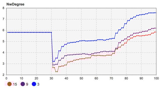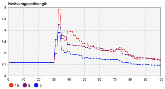 Further observed were the change in network average degree and the average path length when the proportions of seed users were 3%, 9%, and 15%. The simulation results are shown in Figure 12 and Figure 13. The number of seed users did not affect the overall evolution trend of the social network. In the later stage of innovation diffusion, the average degree and the average path length of the social network with seed users of 9% and 15% were also very similar. That is to say, after the final evolution, the social network structure was similar.