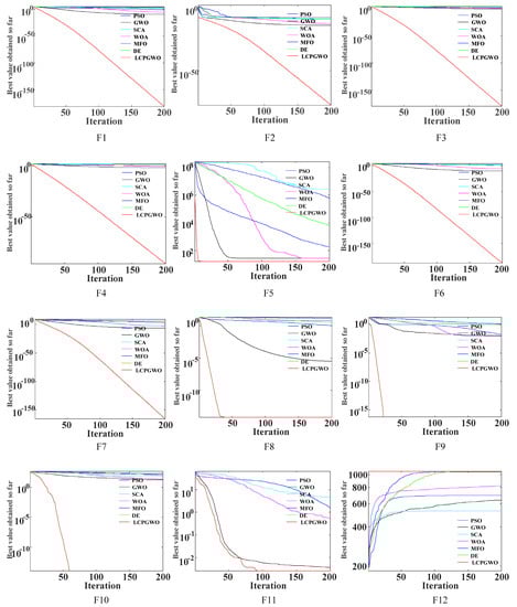 To prove the effectiveness of the proposed LCPGWO algorithm, six well-known nature-inspired optimization algorithms, including PSO, GWO, SCA, WOA, MFO and DE were applied for comparison. Meanwhile, 12 benchmark functions were selected for optimization experiments as listed in Table 1 and divided into two categories, where F1-F7 were unimodal functions and F8-F12 were multimodal functions [,,]. In Table 1, Fmin was the minimum value of each benchmark function. The unimodal functions were mainly employed to test the convergence rate of the algorithms, while the multimodal functions were carried out to test the global exploration ability of the algorithms.