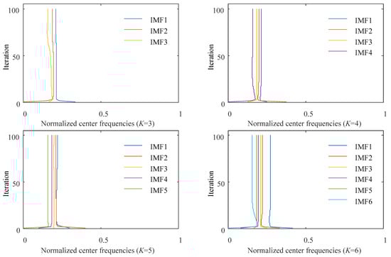 Feature extraction is the main problem in the process of identifying rolling bearing faults. VMD was selected to decompose the fault signal into a set of IMFs. The parameter of decomposing mode number K was decided in advance, where it was determined by the center frequency observation method according to a previous study []. In this paper, the K value was obtained by experiment using sample data under a motor speed of 1800 rpm. As shown in Figure 5, if K is too large, the center frequencies of adjacent IMFs are too close, resulting in mode mixing, which means excessive decomposition. However, if K is too small, the fault signal cannot be effectively decomposed, which leads to more valuable information being ignored. Therefore, the K value in the paper was set as 4.