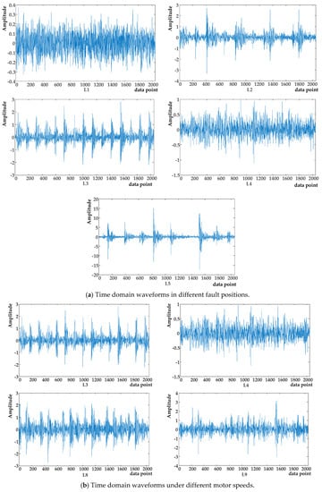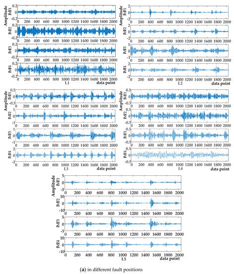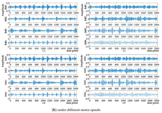 The waveforms of the original signals with different fault positions (L1, L2, L3, L4, L5) and different motor speeds (L3, L4, L8, L9) are illustrated in Figure 6. With VMD decomposition, all the vibration signals were decomposed into four subcomponents including IMF1, IMF2, IMF3, IMF4, as shown in Figure 7. IMFs decomposed from original signals have quite different fluctuation characteristics.