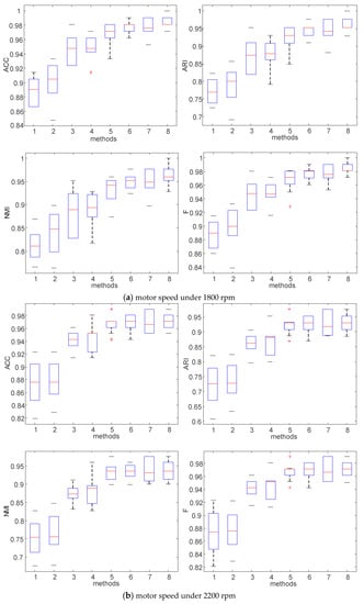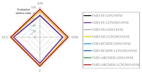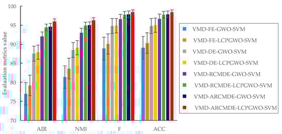Eight relevant methods were employed to compare for illustration of the advantages of the proposed approach in this study. The four evaluation values of fault identification results are shown in Table 7. By comparing with the results of different methods, it proves that the proposed VMD-ARCMDE-LCPGWO-SVM method is the best of four evaluation metrics. It has the highest values at 0.9597, 0.9627, 0.9838, 0.9838 under a motor speed of 1800 rpm and 0.9303, 0.9381, 0.9712, 0.9714 under a motor speed of 2200 rpm. Although the performance of NMI under 2200 rpm was not optimal, it was still very good, which could be considered a desirable result. The evaluation value deviations were also very low. In order to better analyze the results, the results when the motor speed was 1800 rpm were taken as the analysis. For feature extraction, VMD-FE-GWO-SVM, VMD-DE-GWO-SVM, VMD-RCMDE-GWO-SVM and VMD-ARCMDE-GWO-SVM methods were compared, respectively. The ACC of the VMD-ARCMDE-GWO-SVM was 0.9781, which was superior to the VMD-FE-GWO-SVM, VMD-DE-GWO-SVM and VMD-RCMDE-GWO-SVM methods. Similarly, comparing with VMD-FE-LCPGWO-SVM, VMD-DE-LCPGWO-SVM and VMD-RCMDE-LCPGWO-SVM methods, the proposed VMD-ARCMDE-LCPGWO-SVM method also had the highest accuracy. The results revealed that the proposed ARCMDE method was superior for feature extraction.