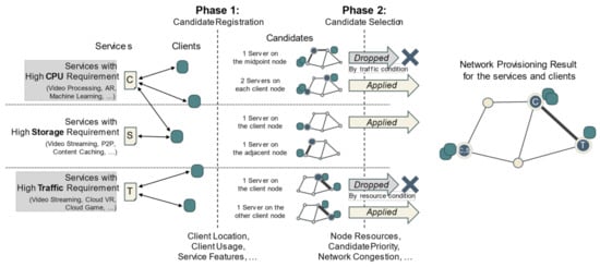 Proposed candidate-based configuration algorithm for a network in which edge computing is used. Phase 1: candidates are created and registered based on the features of each service as well as the location and usage of clients. Phase 2: candidates are selected for services considering node resources and traffic load.
