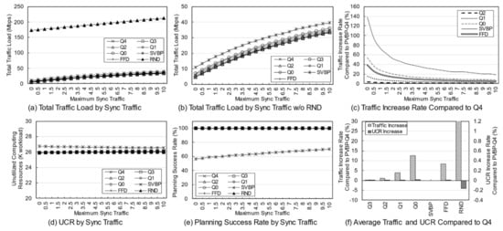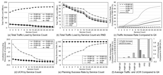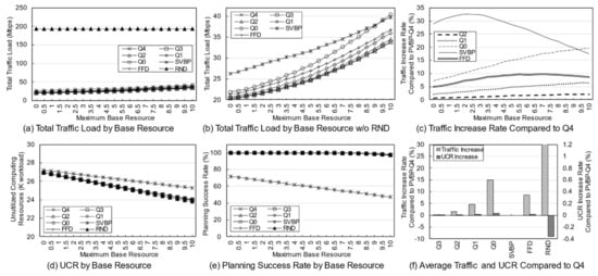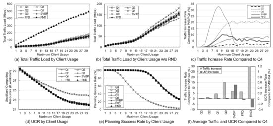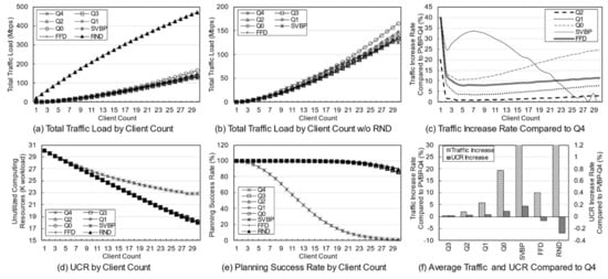 Figure 6f shows the average increase in traffic and unused resources with respect to PVBP-Q4 for each algorithm in the simulation with a variable number of clients. In the case of PVBP, as the traffic weight decreases, the traffic load of the plan increases by up to 20%. The traffic load of Q3 increased by 0.50%, Q0 by 20.21%, FFD by 10.16%, and SVBP by 31.09%. The amount of change in UCR is large compared to the results of the service diversity simulation, because the usage varies according to the number of clients. Q1 and Q0 had 0.04% and 0.1% resources left, respectively, but FFD and RND yielded results that used more resources than the results of Q4 by 0.1% and 0.3%, respectively. In other words, for FFD, which did not strictly consider traffic and resources, the traffic load increased, and the resource utilization efficiency decreased. If FFD is not based on a sorted candidate list, it will yield results close to the results of RND.