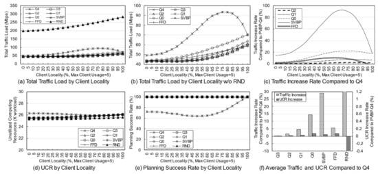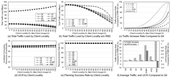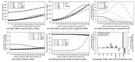 Figure 8c shows the traffic load increase of other algorithms compared to PVBP-Q4 according to client locality when usage is low. As the degree of locality increases, the efficiency of traffic control of other algorithms decreases. Note that when the locality is 100%, the efficiency of SVBP and Q0 become almost equal. This is because both SVBP and Q0 select the server to be replaced based on the vector angle only. Moreover, because all the clients are connected to one node, high priority candidates will be composed of one server. Figure 8d–f also evaluate the performance of the proposed algorithm from the same perspective as the previous simulation. UCR does not change much depending on locality, and the success rate is nearly 100%.