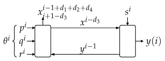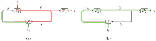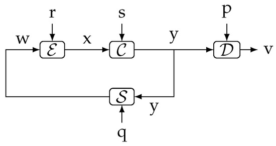 where: . However, in [23] the blocks are defined implicitly, writing instead their input–output relation as collections of stochastic kernels , , . The notation is to be understood as the conditional distribution of t given . Crucially, this entails the implicit assumption that given and , is independent of every other signal in the system (and likewise for ). In the representation of Figure 1a, this corresponds to assuming and .