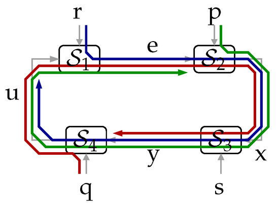 It is well known that mutual information has an important limitation in systems with feedback, such as the one shown in Figure 1a. In this system, p, q, r, s, e, u, x, and y are random sequences, and the blocks are deterministic causal mappings with an added delay of at least one sample. These blocks, randomized by their exogenous random inputs p, q, r, s, may yield any causal stochastic dynamic mappings. As pointed out in [13], for sequences inside the loop, such as x and y, does not distinguish the probabilistic interdependence produced by the effect x has on y from that stemming from the influence of y on x. This limitation motivated the introduction of the directed information in [13]. This notion assesses the amount of information that causally “flows” from a given random and ordered sequence to another. For this reason, it has increasingly found use in diverse applications, including characterizing the capacity of channels with feedback [13,14,15,16], the rate distortion function under causality constraints [5], establishing some of the fundamental limitations in networked control [17,18,19,20,21,22,23], determining causal relationships in neural networks [24], and portfolio theory and hypothesis testing [25], to name a few.