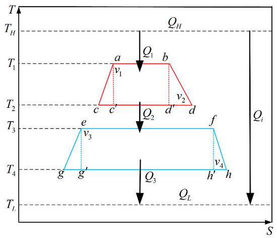 where Q 2 and Q 3 are the amounts of exhausting heat under the endoreversible conditions in top sub-cycle and bottom sub-cycle, respectively; Q 2 and Q 3 are the amounts of exhausting heat under the irreversible conditions in top sub-cycle and bottom sub-cycle, respectively; S a , S b , S c and S d denote entropies of four state points ( a , b , c and d ) under the irreversible conditions in top sub-cycle; S c and S d denote entropies of two state points ( c and d ) under the reversible conditions in top sub-cycle; S e , S f , S g and S h denote entropies of four state points ( e , f , g and h ) under the irreversible conditions in bottom sub-cycle; as well as S g and S h denote entropies of two state points ( g and h ) under the reversible conditions in bottom sub-cycle (see Figure 2).