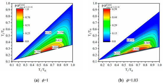Using Equations (19), (20), and (31), the power and thermal efficiency can be rewritten as, respectively,