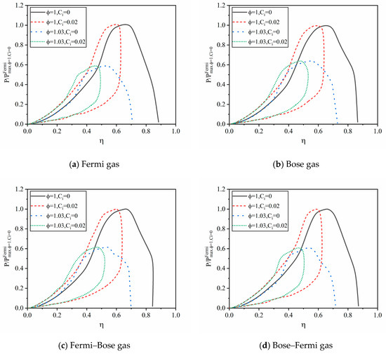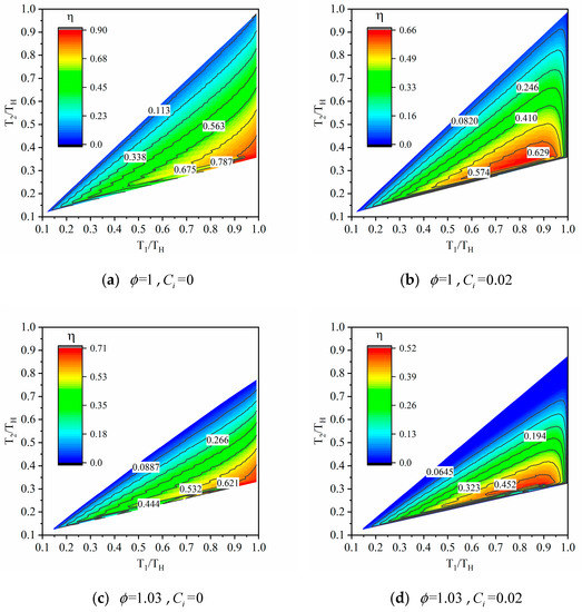 It can be seen from Equations (19) and (20) that only when all the entropy ratios in adiabatic processes of two sub-cycles meet ϕ 1 = ϕ 2 = ϕ 3 = ϕ 4 = 1 , the internal irreversibilities of the two sub-cycles are D 1 = 1 and D 2 = 1 , and the irreversible combined HE cycle is the endoreversible one.