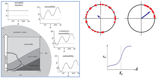It should be noted that the components in both the HKB and Kuramoto models are limit-cycle oscillators. Whereas in the case of HKB, much experimental work went into identifying the functional form of the oscillators and the nature of the coupling [59,92,93,94,95], this is not so in Kuramoto, where the limit-cycle nature of the oscillators is assumed and referred to, for obvious reasons, as a phase oscillator. As for the coupling, a good guess—originally by Winfree—is that each oscillator in the ensemble is affected equally by all the others. Thus, in the case of an audience that starts to clap in unison, each person is affected by the rhythmic applause of the whole room, not by the couple sitting next to them. Winfree was the first to realize that when the oscillators mutually synchronize, this is equivalent to a phase transition in physics. Just as water molecules freeze into ice in space, the oscillators line up in time—frozen, as it were, in a synchronized state. Note that in the Kuramoto model, the nature of the phase transition is always from disorder to order, whereas the nature of the phase transition in HKB is from one ordered coordination state to another (as in the anti-phase to in-phase transition in the original Kelso experiments) or from an ordered state to a partially ordered metastable form of coordination (as in later experiments of coordinating movements with visual and auditory stimuli). Nota bene (Figure 1c) there are no states at all in metastable coordination, only tendencies or dispositions due to the interplay between cooperative and competitive forces. Likewise, fluctuations do not receive a rigorous treatment in Kuramoto’s model, unlike HKB (e.g., [28]; see also [96]).