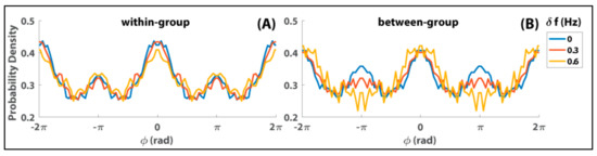 There are many detailed results of this so-called “human firefly” experiment, but here I wish to draw on the ones that are central to reconciling models of the many and the few. Figure 2 shows the distributions of relative phase within episodes of strong interaction in the Zhang et al. [103] experiment. Such episodes correspond to 10,796 dwells in particular phase relations extracted from 258 trials (see Supplementary Information in [103]). The total time of these dwells corresponds to about 14% of the total time of interaction. Within groups (Figure 2A), both in-phase (peak near ϕ = 0) and anti-phase (smaller peak near ϕ = ±π) are dominant coordination patterns, with in- phase stronger than anti-phase, regardless of diversity conditions (δf in color). That is, regardless of whether subjects within a group were paced at the same or different frequencies, they tended to produce both in-phase and anti-phase coordination. Between groups (Figure 2B), the dominance of in-phase coordination was retained across different levels of diversity, but anti-phase lost its attraction with increasing diversity (gradually flattened peaks near ϕ = ±π from blue to red to yellow). Such a result is highly typical of studies of dyadic coordination (e.g., [105,106,107,108,109]) but here also applies to social interaction in mid-sized groups.