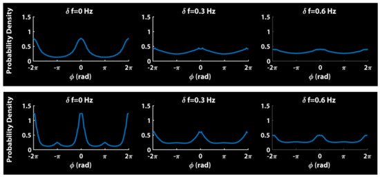 Relative phase distributions of simulations of Equation (3) aggregated over 200 trials with b = 0 (top row) and positive values of a and b (bottom row). The probability density of relative phase is plotted as a function of frequency diversity (δf = 0, 0.3, 0.6 Hz). Adapted from [102].