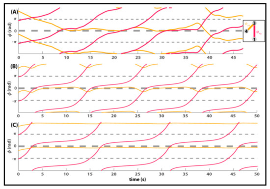 How coordinative relations (relative phase trajectories over time) are affected by nonuniform coupling between three interacting subjects (A) or (B,C) three agents according to computer simulations of Equation (3). The small box shows the experimental arrangement. In (A), subjects 1 and 3 are metastable and 3 and 4 are in-phase for most of the trial. See text for detailed discussion. In (B), agents 3 and 4 are nonuniformly coupled (a3 > a4) with all other couplings smaller and equal. In (C), agents 3 and 4 have equal and greater coupling (a3 = a4) than all others. The point is that Equation (3) produces the detailed microdynamics among interacting components. Adapted from [102].