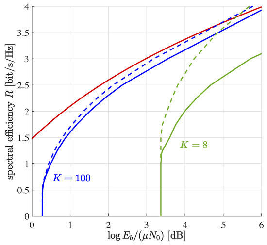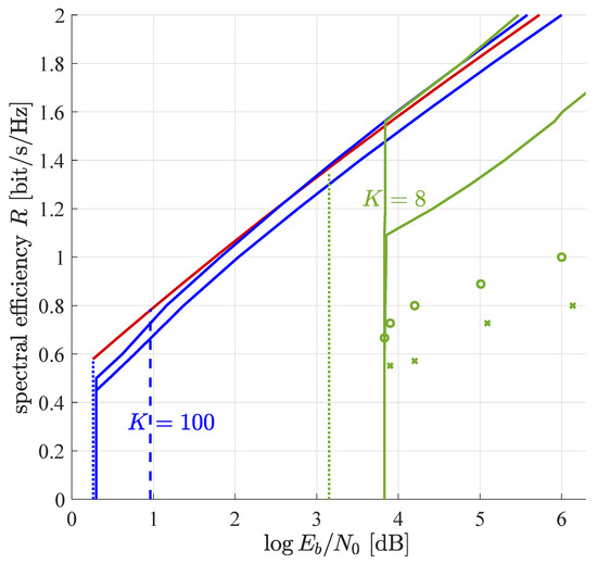 For the simulation points at 5 dB and above, the power profile is optimized by try and error, as the linear program (29) cannot be utilized for finite M. To keep the size of the search space reasonable, only groups are considered. In all cases, the largest group of devices contains 256 and 32 devices, respectively, that operate with minimum power to achieve the target block error rate of . At average dB, a second group with 64, respectively 8, devices of larger power is added. This increases the total number of devices to 320, respectively 40. Due to the devices with higher power, the average raises. At the same time, the parameter N can be reduced, such that the spectral efficiency increases, as well. At average dB, the second device group is chosen twice as large as for dB. Although the simulation results fall quantitatively behind the theoretical predictions for , they show the same qualitative behavior as the proposed theory. Recent subsequent works [30,31] show that simulations based on approximate message passing instead of basic soft interference cancellation perform well between the asymptotic bounds proposed in this paper.