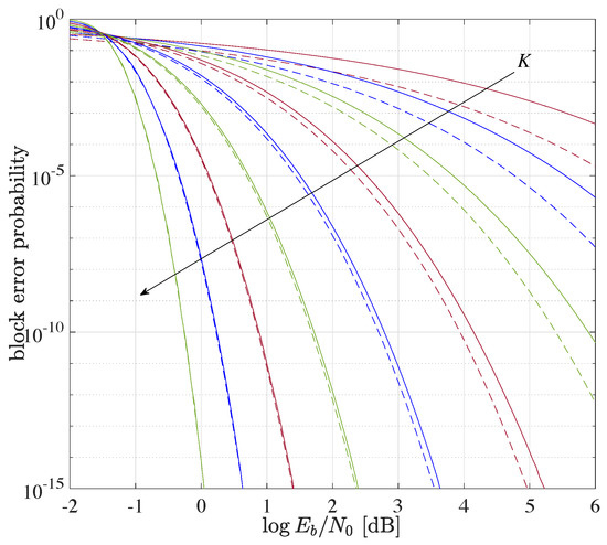 The block error probability at the minimum possible is shown in Figure 2 for various message lengths K. The solid and dashed lines refer to (31) and the lower bound [32]