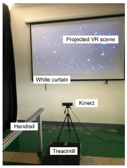 A custom-made treadmill system was used to allow subjects to walk on the treadmill at predetermined speeds. The treadmill system comprised of two belts and a handrail shown as in Figure 1. For each belt, a three-phase permanent magnet synchronous motor was incorporated to drive the motion of the belt. The speed command of the treadmill system was updated through an embedded ARM controller with a frequency of 100 Hz. The custom-made treadmill system has been proved valid in our previous works [13,14]. The Unity3D software was used to build the VR scene in Figure 1. The scene was consisted of blue balls with random locations. By adding sinusoid oscillation movements to these balls, they can simulate viewpoint oscillations and therefore enhance vection. Similar VEs have been used in several existing vection studies [15,16]. During treadmill walking, the VR scene was projected on the white curtain by a projector located at the rear of the treadmill.