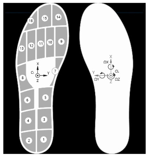 An insole plantar pressure measuring device named OpenGo v2 was adopted to obtain the M-L CoP signal during treadmill walking. The OpenGo v2 system has 16 pressure sensors distributed across the insole embedded with a 6-axis inertial measurement unit located at the center. Details of pressure sensor locations can be found in Figure 2. The OpenGo v2 system can run at 10, 50, and 100 Hz which was chosen in this study. Additionally, the system has an internal flash memory to store real-time pressure data. An app version of Moticon software was installed in a Samsung mobile phone to connect with the OpenGo v2 system through Blue Tooth protocol. The pressure data can then be recorded by the mobile phone and wirelessly transferred to a computer installed with a desktop version of Moticon software. Since the OpenGo v2 system is cableless, it is highly desirable for measuring plantar pressure with no intrusiveness to user’s walking experience [17].