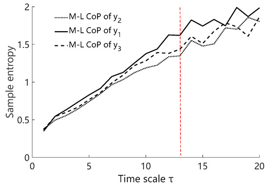 Parameter selection of MSE was conducted based on the rules in [21]. As a result, the template vector length m equaled to 2; the point matching tolerance r equaled to 0.2 times the signal standard deviation; the largest analyzed time scale τ was determined as 13 where the SE of subsequent time scales became unstable (Figure 4).