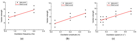 Pearson correlation analysis and linear curve fitting results proved that there was a strong positive correlation between the oscillation frequency and the vection strength (r = 0.764, p < 0.001) shown in Figure 5a. The vection strength also displayed a strong positive correlation with the oscillation amplitude (r = 0.875, p < 0.001) and speed (r = 0.840, p < 0.001) shown in Figure 5b,c, respectively.