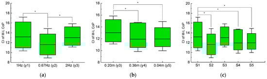 The post hoc results showed that for different oscillation frequencies, the M-L CoP complexity of y2 oscillation pattern was significantly smaller than that of y1 (p = 0.001) and y3 (p = 0.003) pattern. The complexity between y1 and y3 pattern was not different. As for oscillation amplitudes, the M-L CoP complexity of y3 pattern was significantly larger than that of y4 (p < 0.001) and y5 (p < 0.001) pattern. There was no difference between the complexity of y4 and y5 pattern. For oscillation speeds, the M-L CoP complexity of S1 speed was significantly larger than that of S2 (p < 0.001), S4 (p = 0.002) and S5 (p = 0.002) speed. Besides, the M-L CoP complexity of S3 speed was significantly larger than that of S2 (p < 0.001), S4 (p = 0.005) and S5 (p = 0.006) speed, and smaller than that of S1 speed but not significant (mean difference = −0.161, p = 0.648). The complexity of S2, S4 and S5 speed were not different from each other. Details can be found in Figure 6.