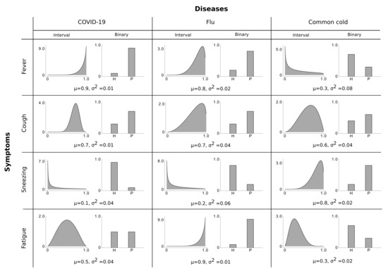 A disease profile illustrating the differences between a binary and a continuous interval encoding of the observables. Here, the interval is used to model the severity of the symptoms where for 0 the symptom is completely absent while 1 models the most severe (most pathological) state of the symptom. For binary symptoms, the states ’H’ and ’P’ refer to the ‘healthy’ and ‘pathological’, respectively. From the figure, it can be seen that a continuous interval encoding models a higher order statistics of the data and could provide more information compared to a binary encoding. For instance, the statistical properties of the symptom “cough” for “COVID-19” and “flu” can be distinguished if an interval encoding is used, while a binary encoding makes this symptom identical for the two causes.