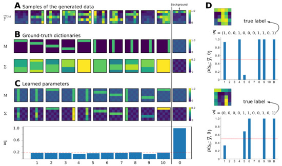 For our experiment, we generated iid data points according to the Beta-MCA model with the settings mentioned above (see Figure 2A for the illustration of such data points). Next, we used the full EM procedure presented in Algorithm 1 to recover the ground-truth parameters (50 EM iterations were observed to be sufficient). To initialize matrices W and V, we randomly (uniform) chose data points and then computed the values of and and rearranged the results into two different matrices with entries. The matrix obtained from the values of was used for the initialization of W and the other for the initialization of V. We also initialized values at . The results are then presented in Figure 2 where the background parameters are deliberately separated for the sake of a better visualization.