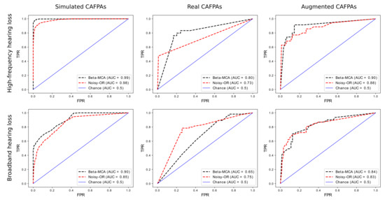 Especially for medical data, seemingly small differences of ROC curves can be very important in practice. As an example, we may again use COVID-19. For detections of COVID-19 infections it is very important to not miss an infection. Therefore, a classifier would have to operate at a high true positive rate (TPR, also known as sensitivity) ideally at >0.99. So, if the disease cause of the top-left plot of Figure 3 was COVID-19 instead of high-frequency hearing loss, then we could operate a Beta-MCA-based classifier above 99% TPR and it would produce less than 10% false positives (wrongly positive COVID-19 diagnoses). The noisy-OR-based classifier, on the other hand, would produce approximately 30% false positives in that case, i.e., more than three times as many patients would wrongly be diagnosed COVID-19 positive.