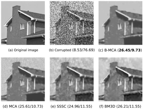 Denoising of the house image corrupted by Beta noise with . (a) is the original noiseless image, and (b) the image with Beta-noise. (c–f) depict reconstructed images obtained by applying four different data models. Numbers in parentheses are the corresponding PSNR (in dB) and MSE values (first number is PSNR, second number is MSE). As it can be seen, the Beta-MCA (B-MCA) model improves on the other three approaches, which is consistent with the here used Beta noise. See text for further details.