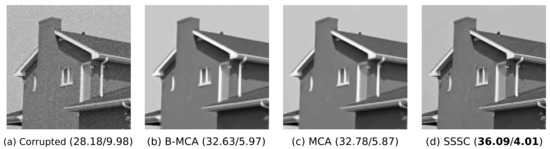 Denoising of the house image corrupted by Gaussian noise. (a) Image with added Gaussian-noise. (b–d) depict reconstructed images obtained by applying three different data models. Numbers in parentheses are the corresponding PSNR (in dB) and MSE values (first number is PSNR, second number is MSE). As illustrated, denoising with Beta-MCA (B-MCA) and (Gaussian-)MCA works similarly well but the SSSC model shows the best performance. See text for further details.