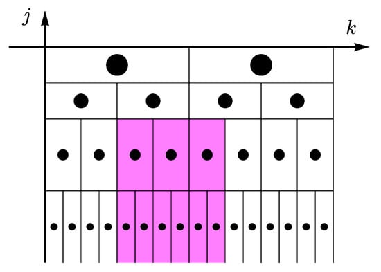 where and . Here, we chose , that is related to the -norm, because it is robust against outliers. Sometimes, researchers denote them as “1-leaders MF”, to distinguish different values of p. Hence, for a given k and j, the summation is taken over the region shown in the schematic representation of Figure 1.